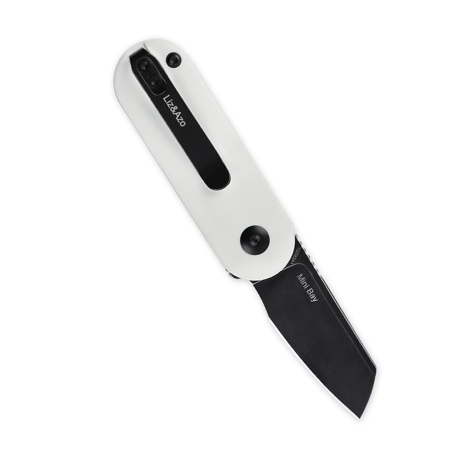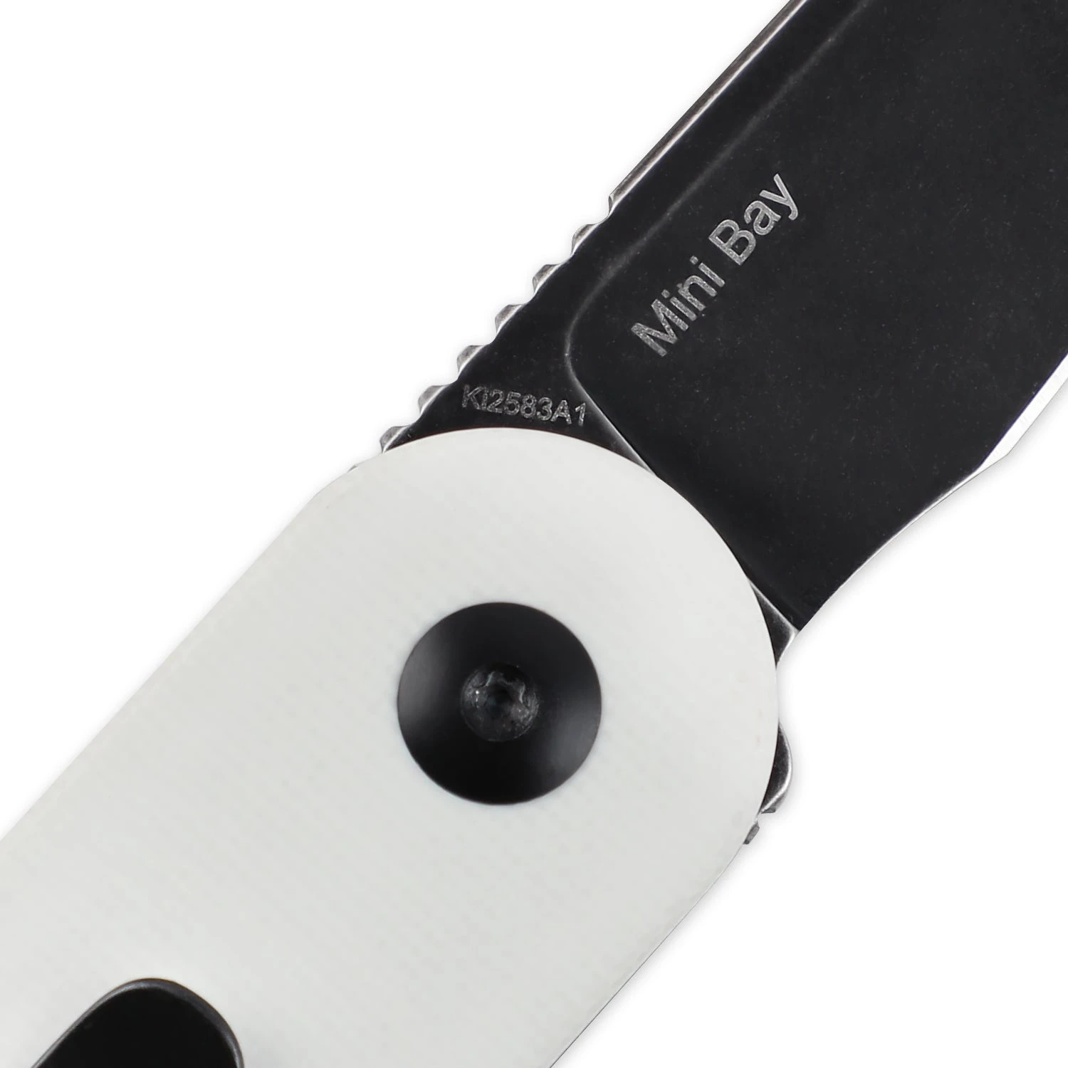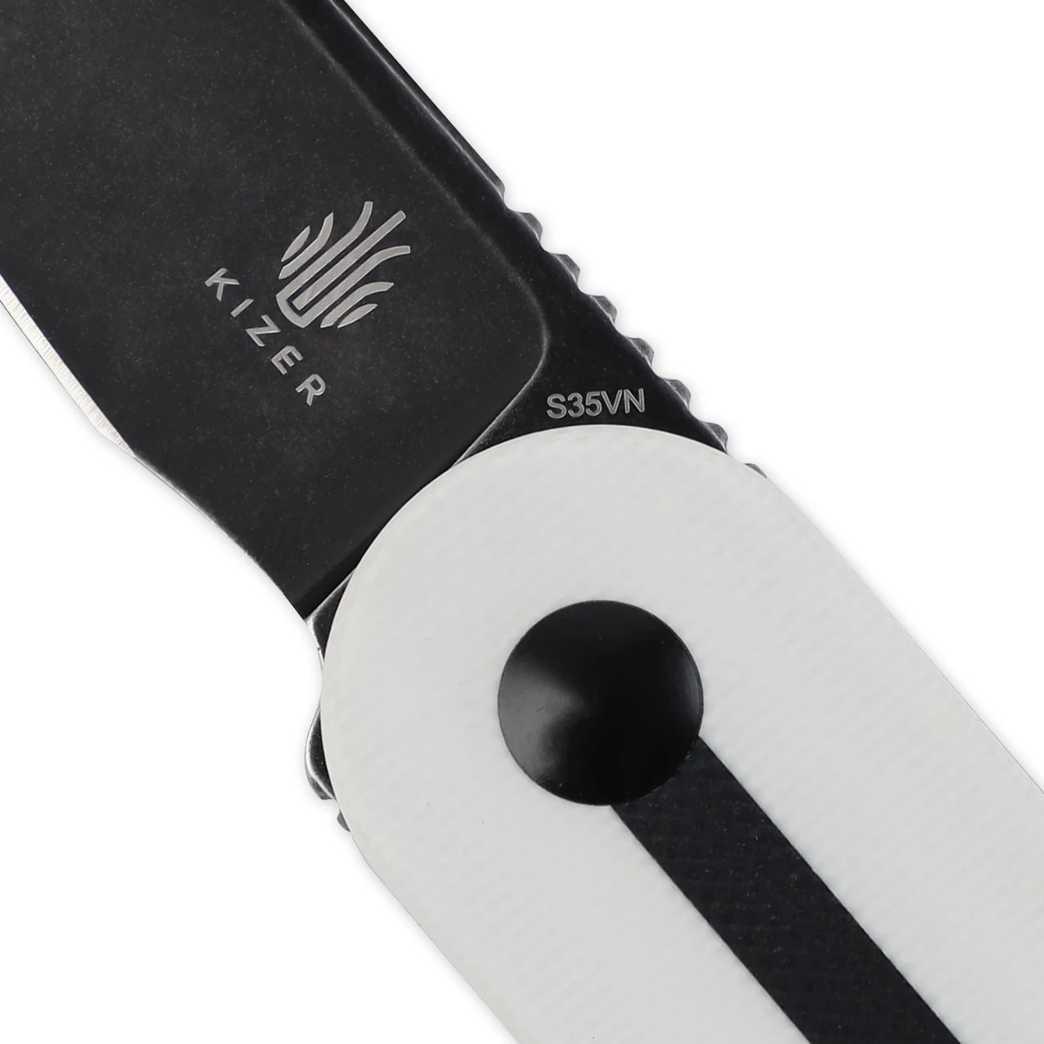 The Mini Bay is one of three detent action knives that Kizer has produced. This extremely compact knife features a subtle flipper opener with jimping, a handle with triple G-10 layering with red, white, and black, and a satin finished pocket clip with a lanyard hole cutout on the top of the clip. The finger choil on the blade keeps it from closing unwantedly. The Mini Bay blade is a wharncliffe made from S35VN steel with black coated finish.