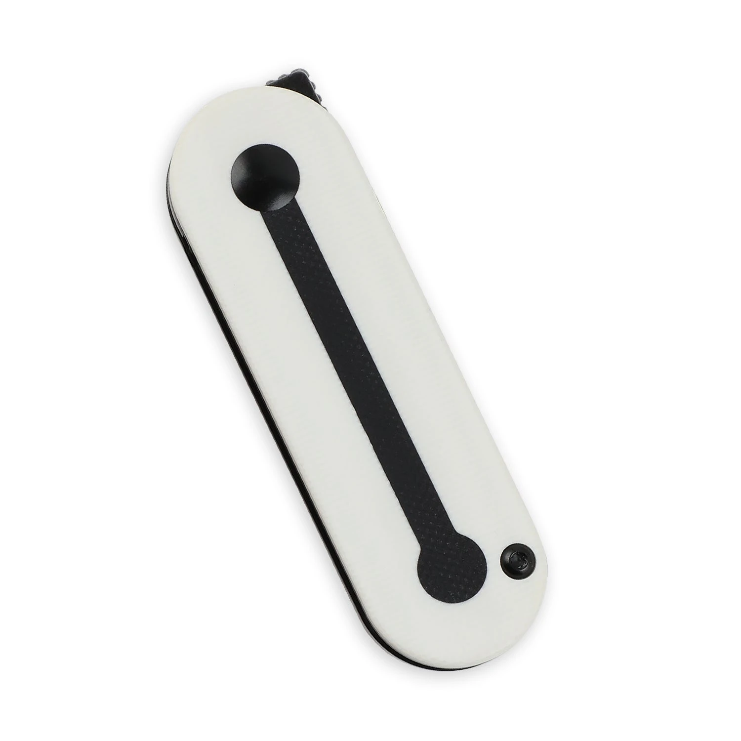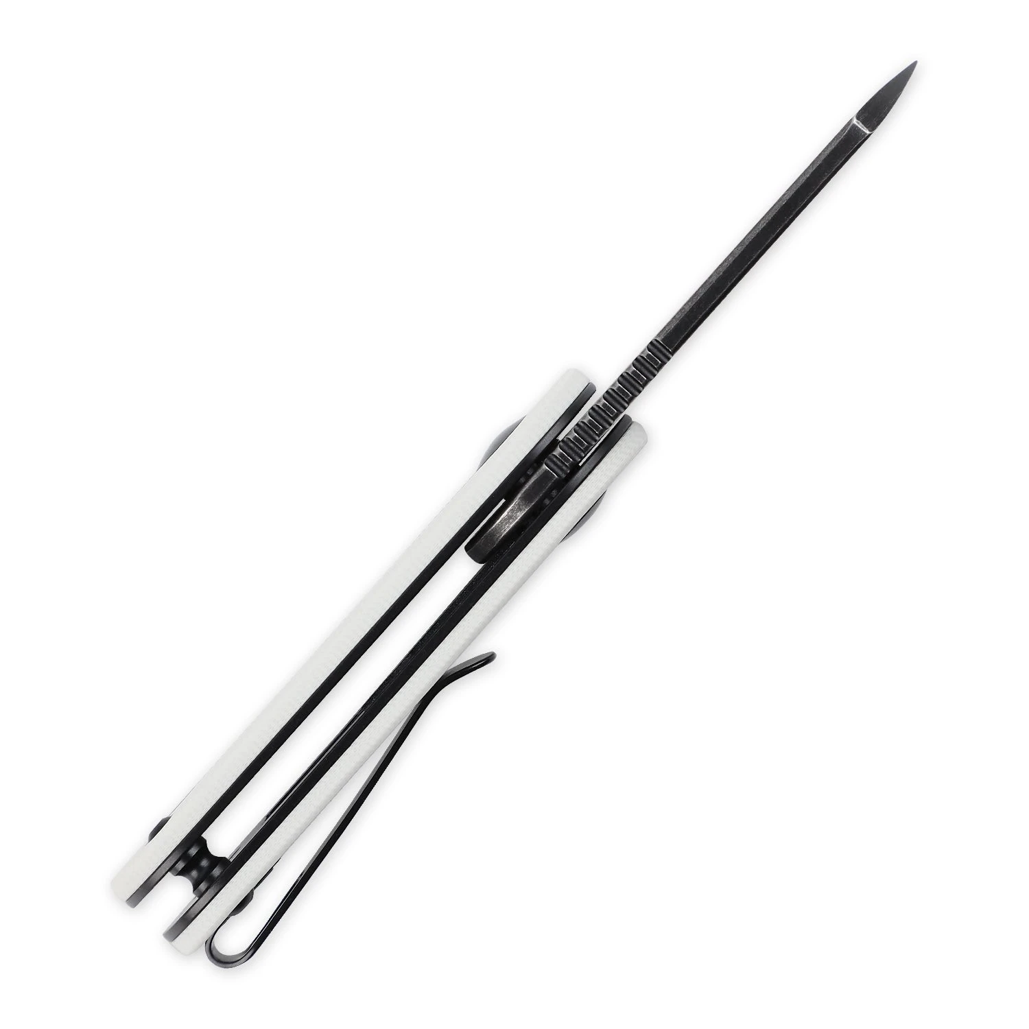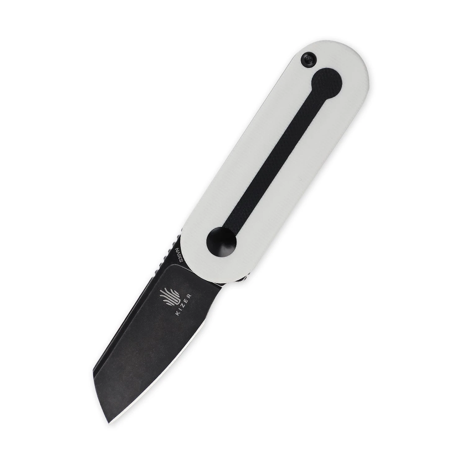 The Mini Bay is one of three detent action knives that Kizer has produced. This extremely compact knife features a subtle flipper opener with jimping, a handle with triple G-10 layering with red, white, and black, and a satin finished pocket clip with a lanyard hole cutout on the top of the clip. The finger choil on the blade keeps it from closing unwantedly. The Mini Bay blade is a wharncliffe made from S35VN steel with black coated finish.