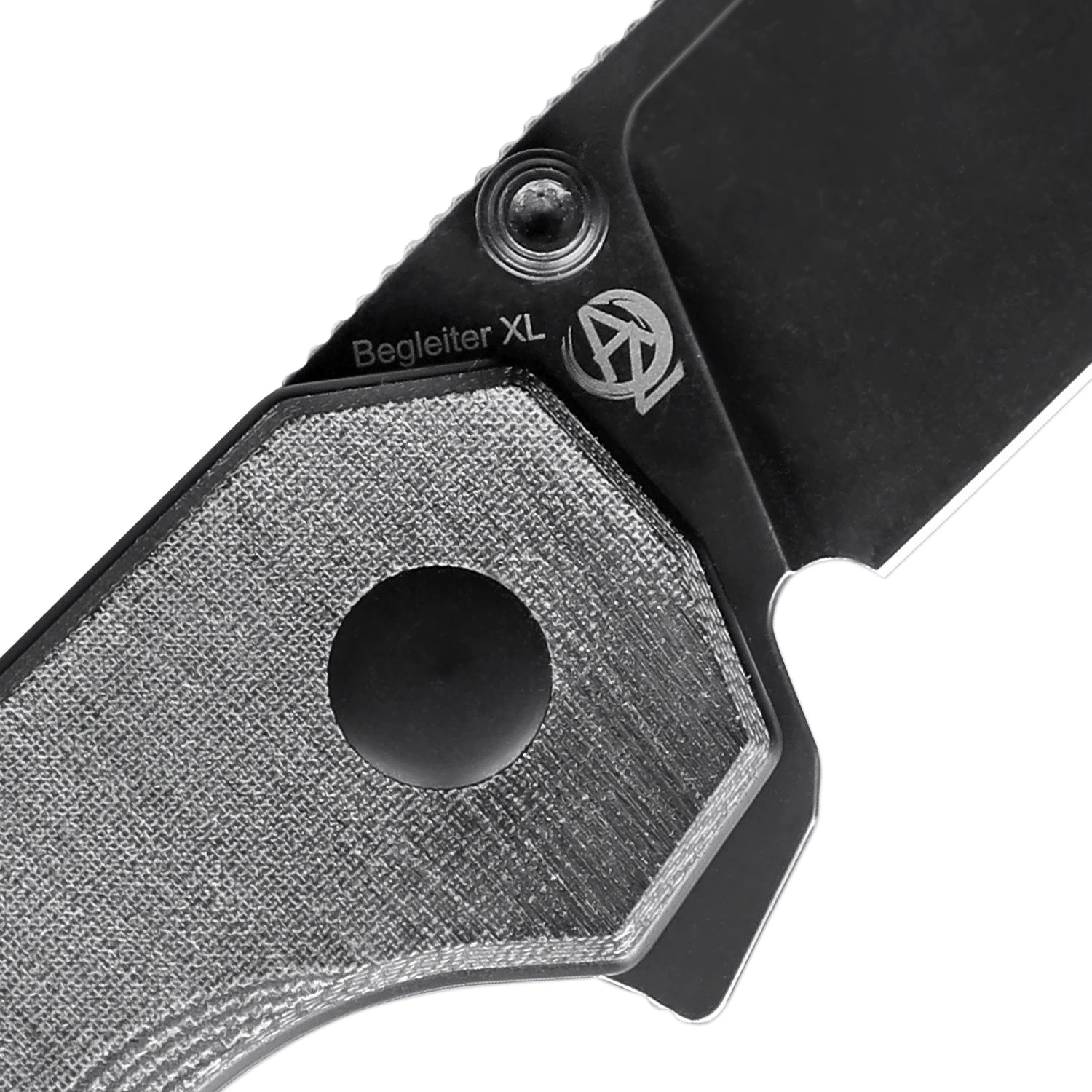 Unique button lock. In this Begleiter (XL), our way of locking the knife is different from previous designs, we designed a button lock for this knife. This is a new design by Azo that realizes the combination of Begleiter and button lock.