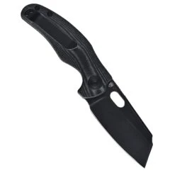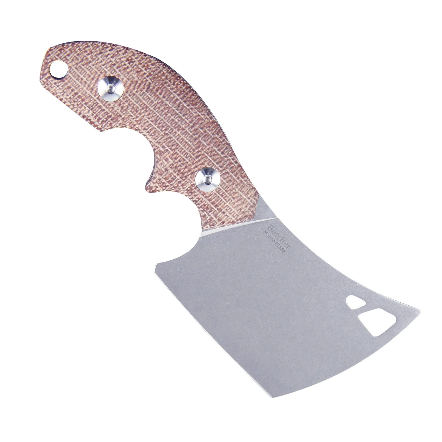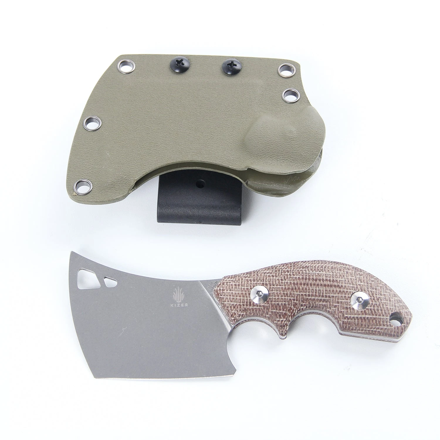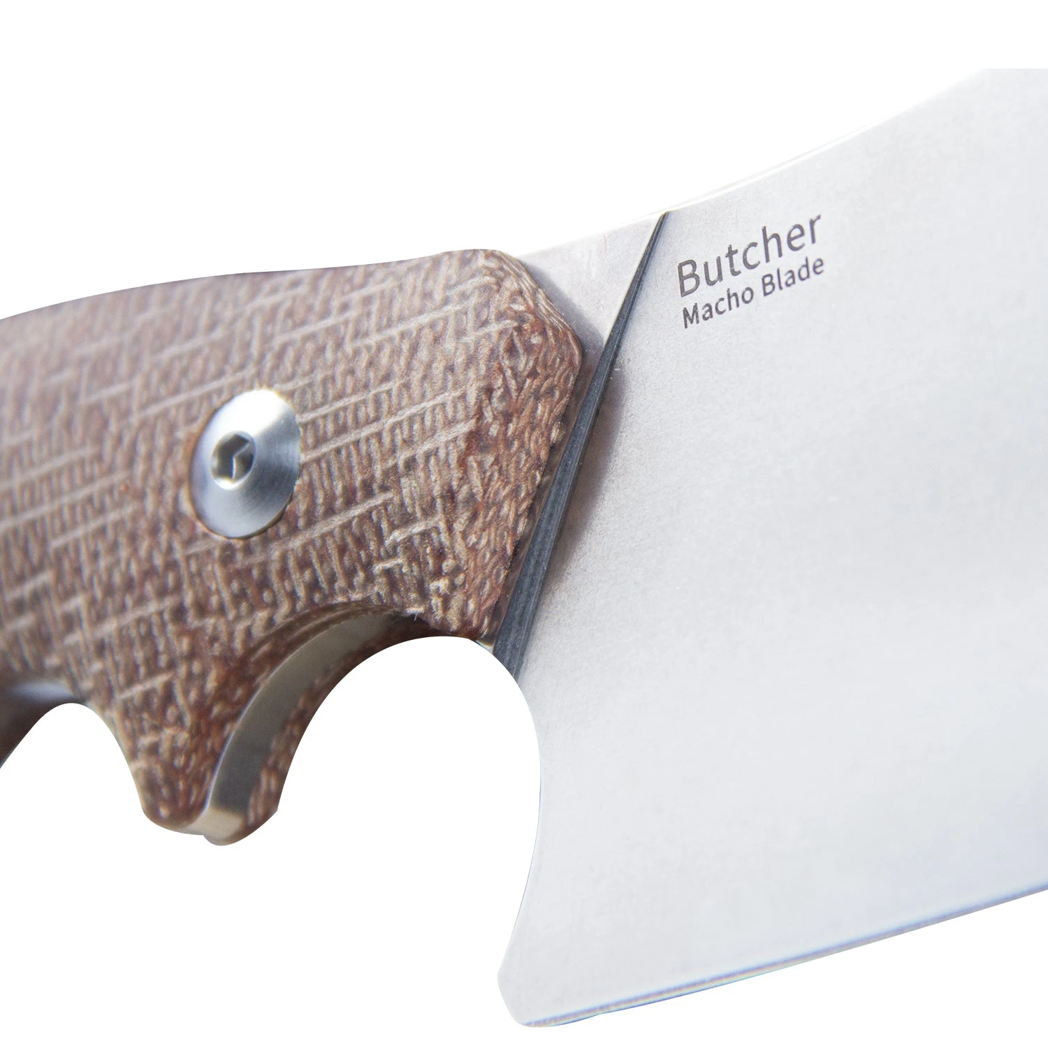 Butcher is a compact fixed blade cleaver designed by Macho Blades. It’s actually a surprisingly ergonomic and practical knife. The blade is just 2.44″ with an overall length of 5.67″. It has a micarta handle with dual finger choils, so it is secure even in hard use. The included coyote tan molded Kydex sheath includes a horizontal carry belt clip for easy carry.