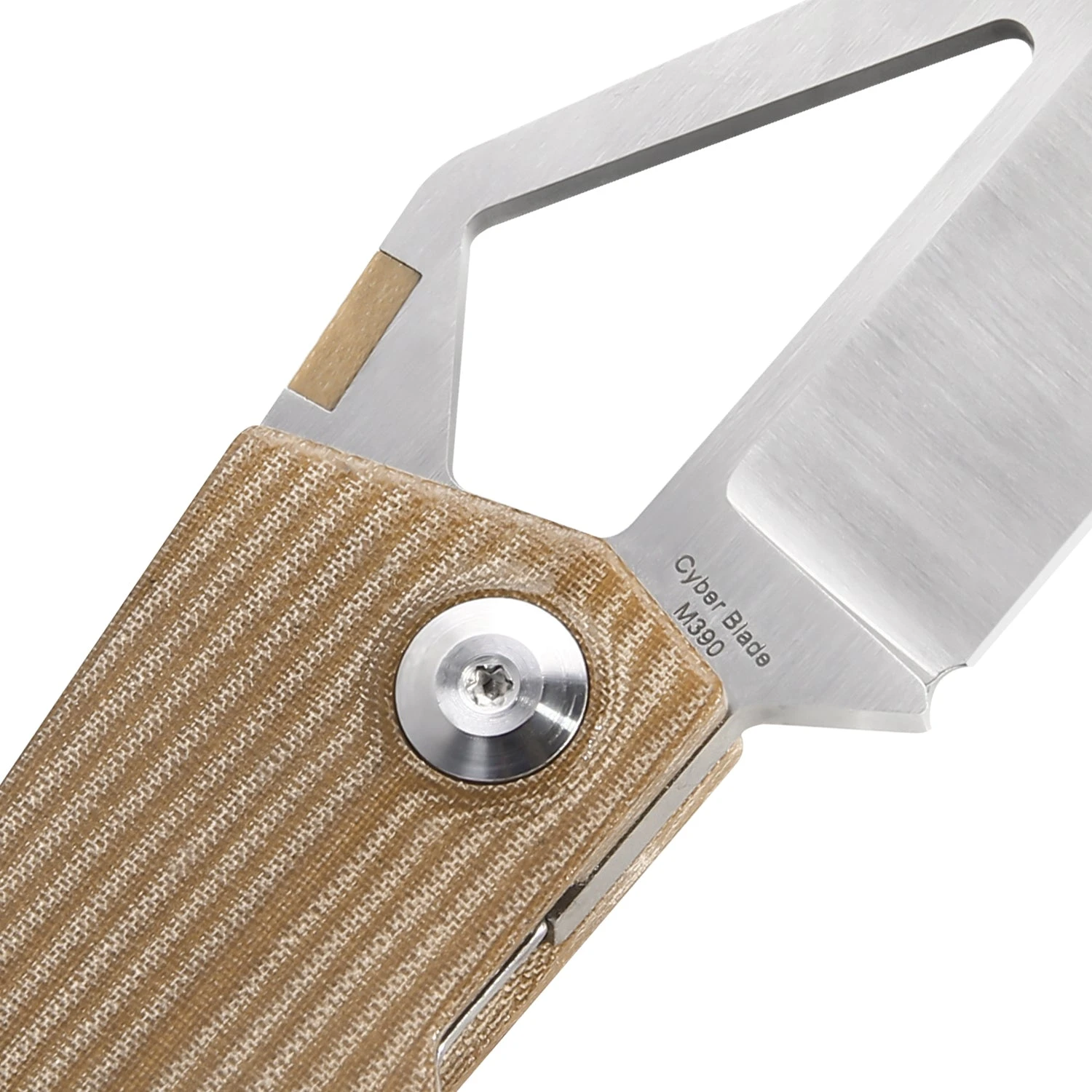This model of the Cyber Blade has a brown micarta handle with a satin finished Bohler M390 tanto blade.This knife design was inspired by the Tesla Cybertruck. The Cyber Blade has a thick, modified tanto blade. The straight edge at the tip is great for most scraping tasks. The blade overall is great for cutting through tough boxes or cables. To top off the design, a glass breaker tip has been added.