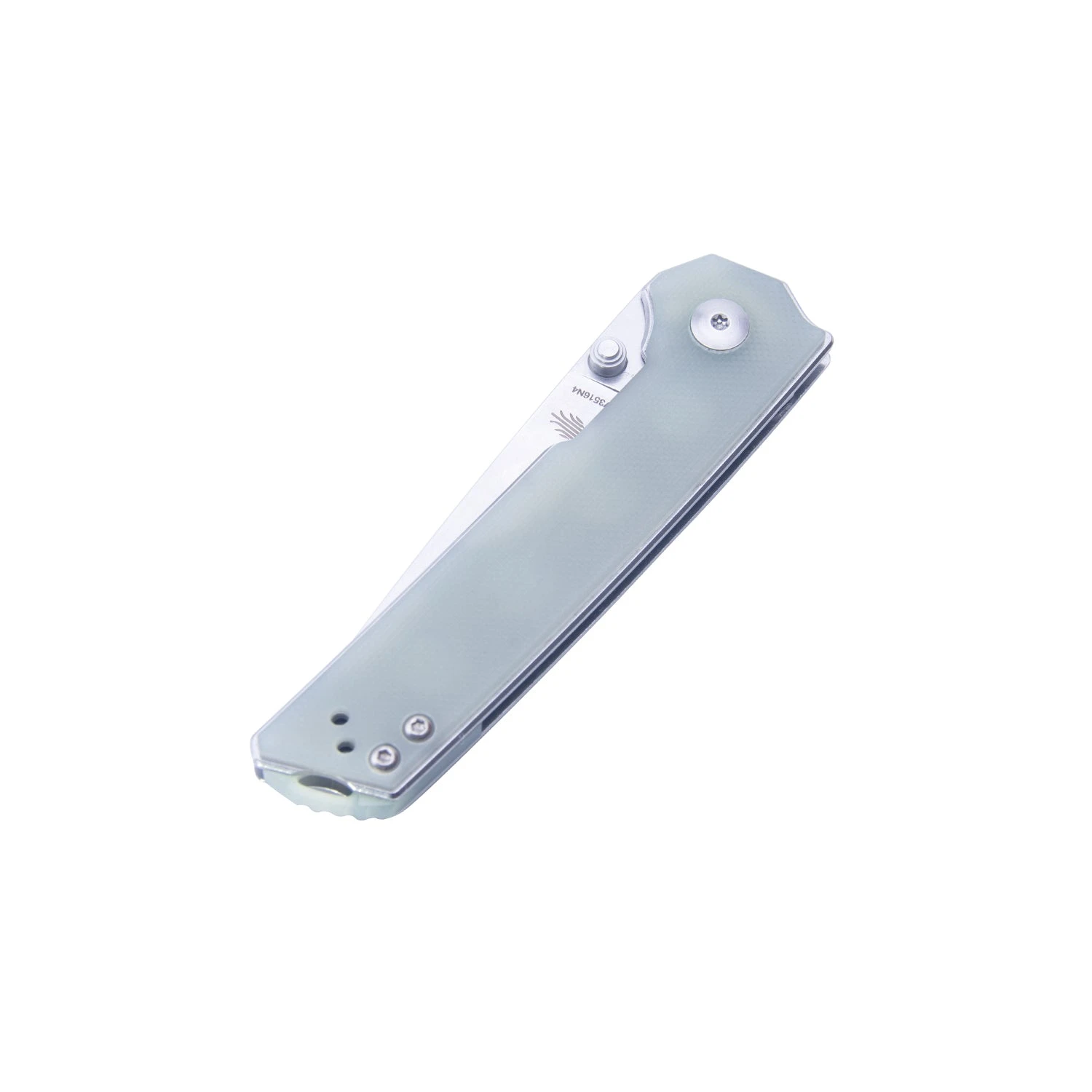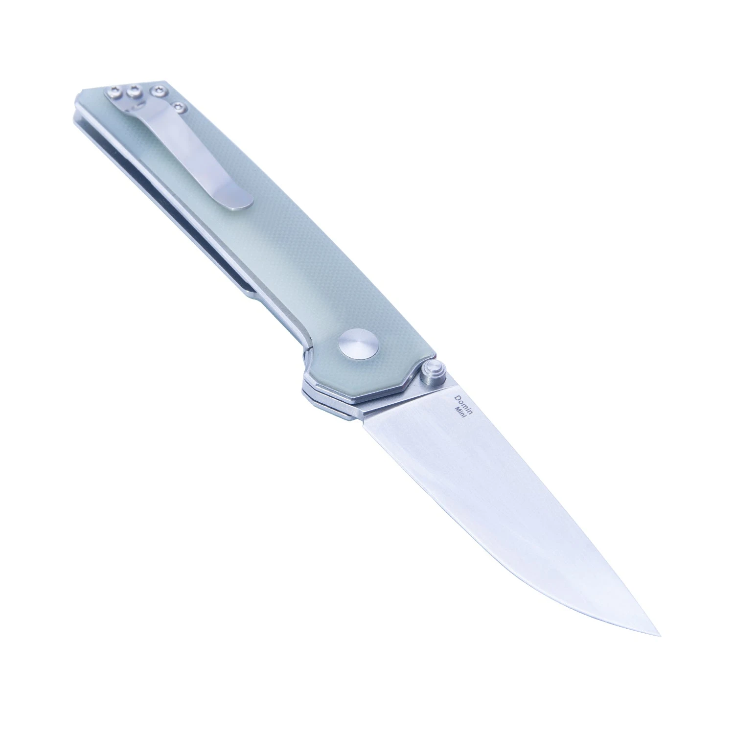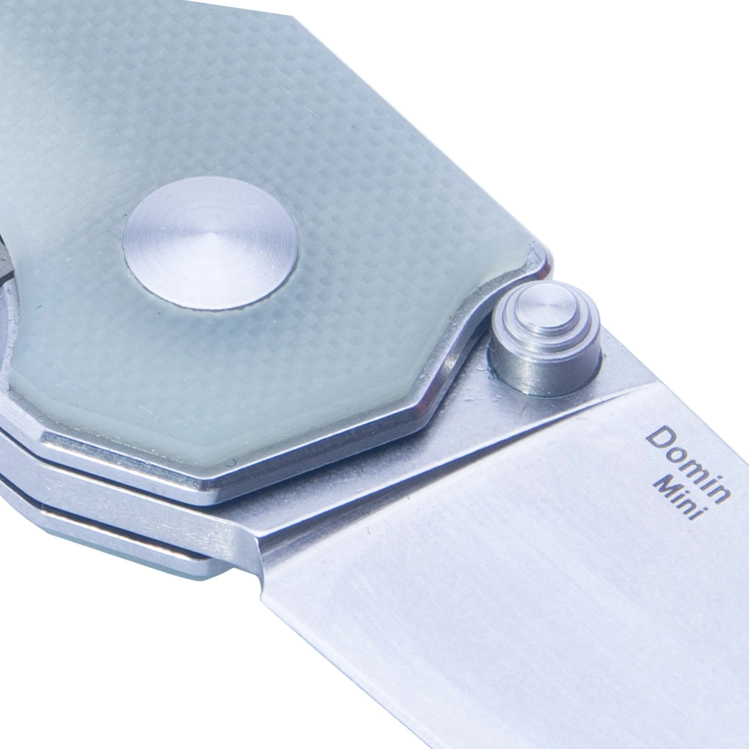 This Domin Mini model is built with a stonewashed blade and a transparent G-10 handle.