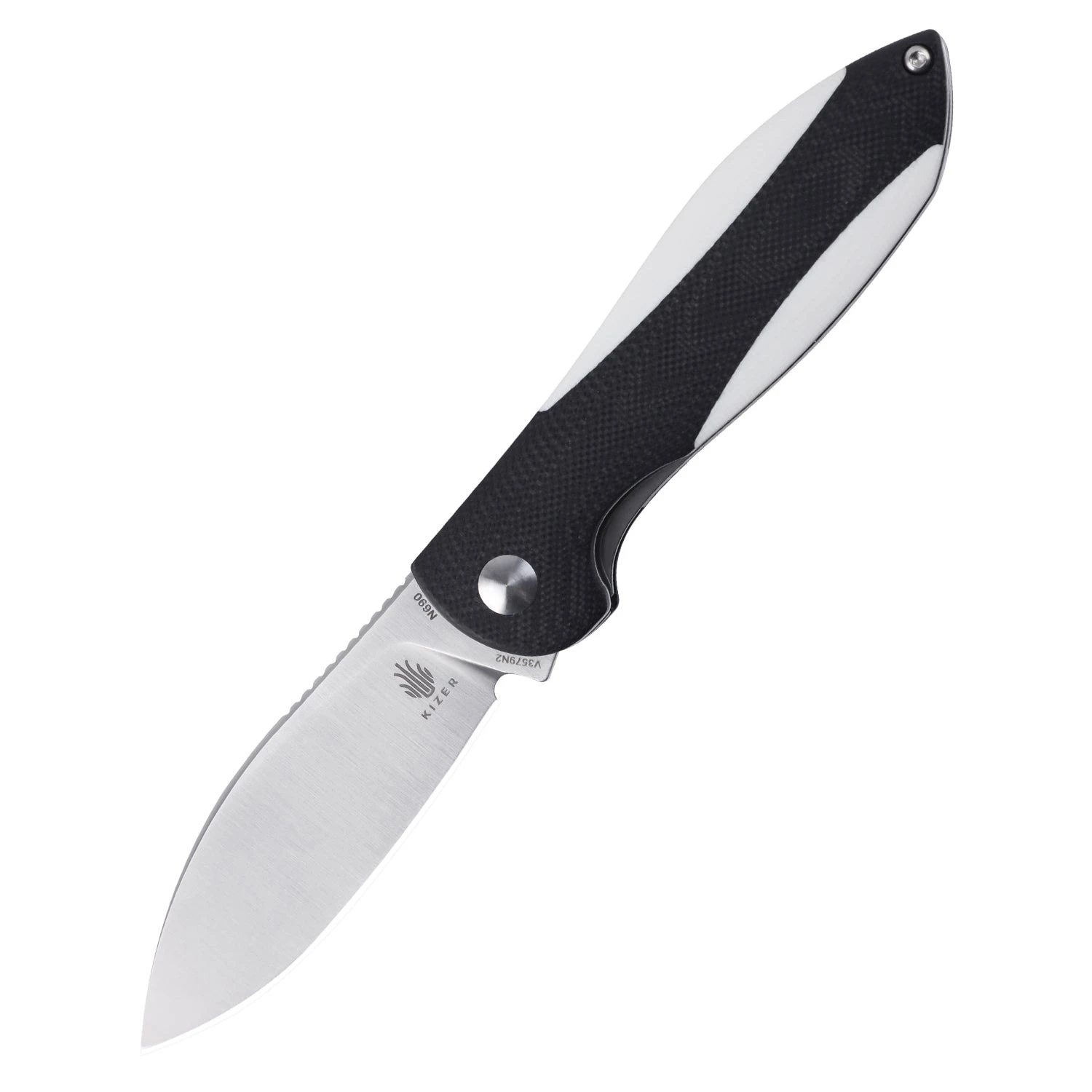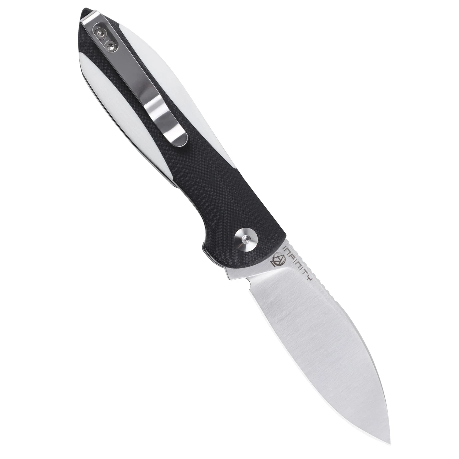 This Infinity model sports a black and white G-10 handle and a satin Bohler N690 stainless steel blade in a drop point shape.The Infinity knife utilizes a leaf-like drop point blade and a tall flat grind for excellent cutting and slicing performance. The front flipper is equipped with a ball bearing system to provide snappy opening action. The blade and the handle together were designed to form the mathematical infinity symbol. The contouring of the handle is comfortable to hold in the fingers