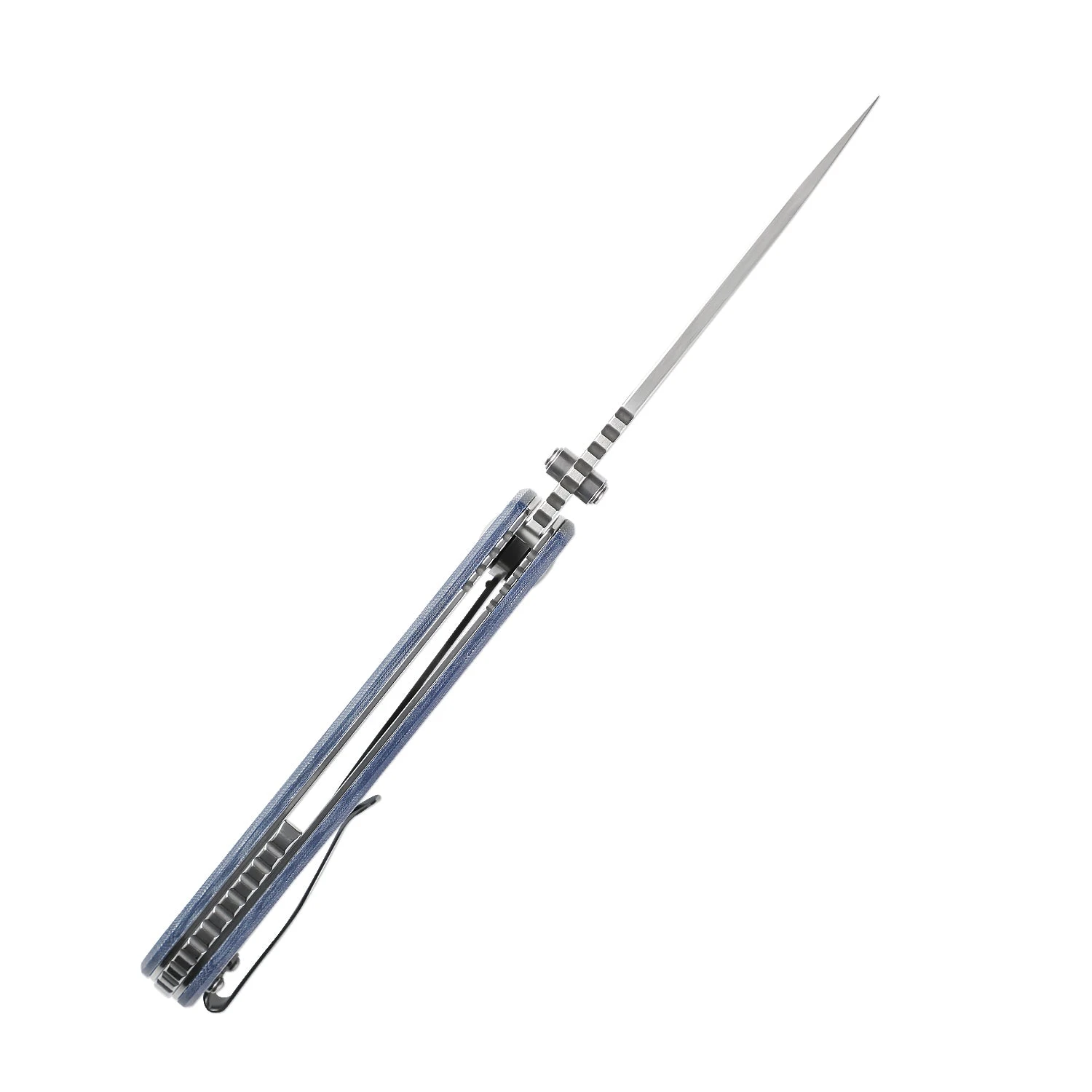 Justice folding knife features blue Micarta handle scales. The Justice is designed by Nhut Huynh and Azo. It has full stainless steel liners, a liner lock, and a reversible, deep carry pocket clip. The stainless steel clip is for tip-up carry and has a decorative blue stripe. The blade can be deployed with either the thumb stud or flipper tab. The drop point blade is made out of N690 steel, which is great for ease of sharpening and toughness. The Justice is topped off with a removable glass breaker.