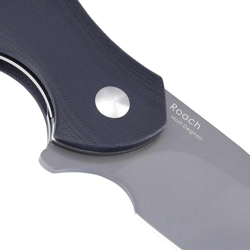 The Matt Degnan-designed Roach knife is an exciting Kizer model that’s made its way to their Vanguard lineup. It has a wide spear point style N690 stainless steel blade with a gray titanium coating. The handle is contoured orange G-10 with a G-10 backspacer and a stainless steel liner lock frame. The pocket clip is oriented for tip-up carry and marked with a Roach logo.