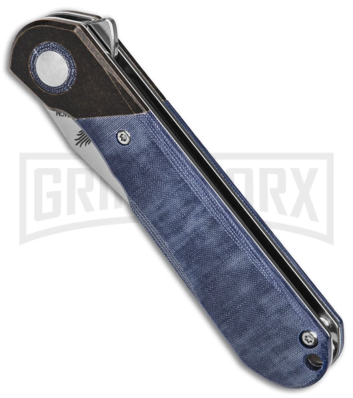 This Kizer Vanguard Comet has a blue denim micarta handle with black brass bolsters and a satin-finished blade.